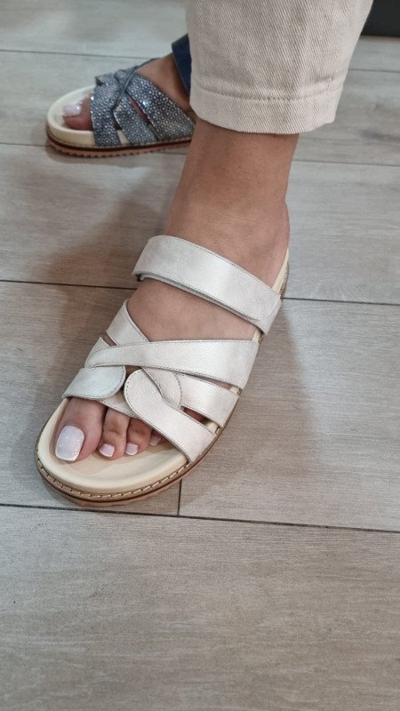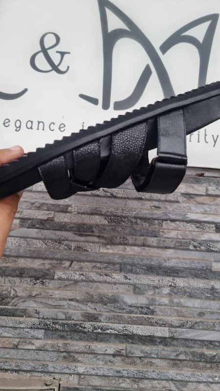 liez confort et raffinement avec ces sandales L.M Confort au design unique. Confectionnées avec un cuir de haute qualité, elles se distinguent par leurs brides texturées effet galuchat et leur finition bleu nuit subtilement brillante. La semelle intérieure moelleuse et ergonomique assure un maintien optimal tout au long de la journée. Un modèle parfait pour vos journées estivales, à la fois chic et décontracté. Caractéristiques : Dessus : Cuir véritable texturé Couleur : Bleu nuit & argenté Fermeture : Bride à scratch pour un ajustement facile Semelle : Confort anatomique, antidérapante Fabriqué avec soin pour une durabilité optimale